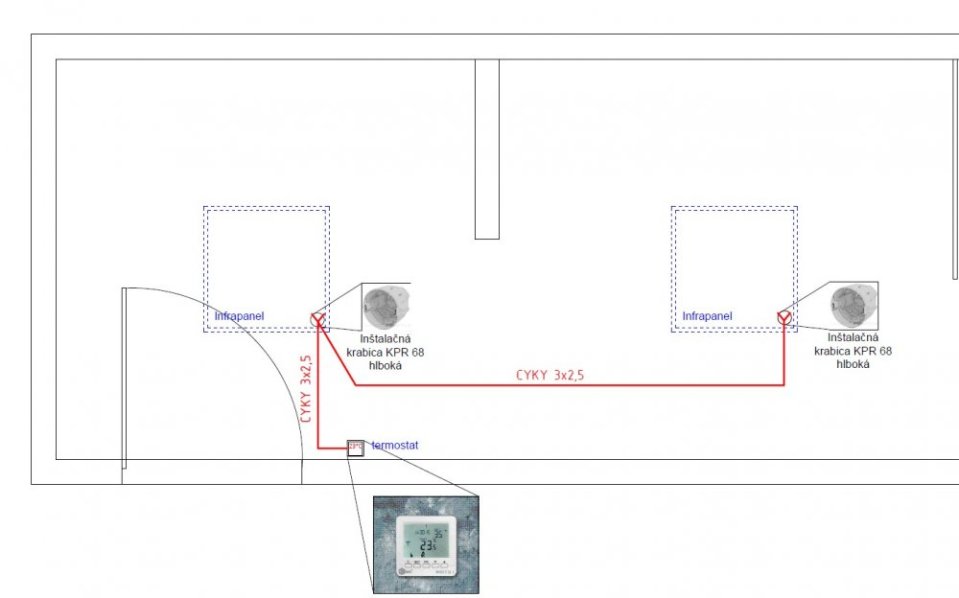Stropné infrapanely bez termostatu sú dodávané s vydlicou priamo do zásuvky a dĺžkou kábla 1,9m. Spínanie panelu je preto nutné realizovať pomocou nástenného termostatu - v tomto prípade je už potreba pripraviť kabeláž tak aby bolo možné použiť nástenný termostat. Odporúčame kábel priviesť do termostatu ( najlepšie z najbližšej zásuvky ak ide o jeden/dva panely alebo priamo z rozvádzača ak ide o viac panelov) káblom CYKY 3x2,5 a následne od termostatu natiahnuť kábel CYKY 3x2,5 do pozície kde bude infrapanel a ukončiť ho v inštalačnej krabice KP68 (ideálne hlbokej). Prívodný kábel ku infrapanelu následne skrátite a napojíte na pripravený prívod ( odporúčame použiť WAGO svorky). Odstrihnutím vydlice nestrácate záruku na infrapanel!